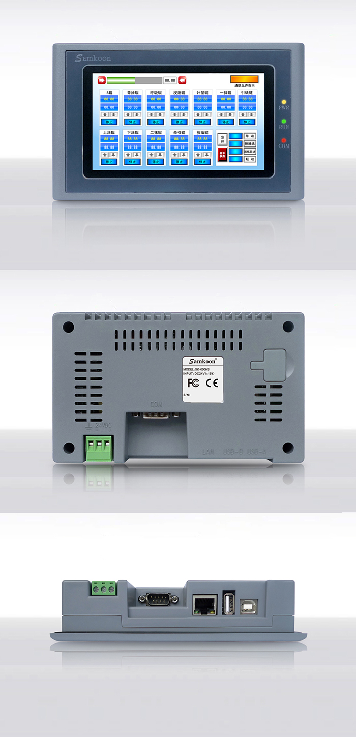 Samkoon SK系列觸摸屏是一款基于Linux系統(tǒng)的人機(jī)界面,符合EN55022和EN55024標(biāo)準(zhǔn),符合FCC、CE、Class A,具有很強(qiáng)的抗干擾能力,符合工業(yè)環(huán)境的電磁兼容要求。該款產(chǎn)品配備有高性能的Cortex A8處理器,及高容量FLASH,可存儲大量數(shù)據(jù),實(shí)現(xiàn)數(shù)據(jù)斷電不丟失;支持U盤存儲,可以實(shí)現(xiàn)數(shù)據(jù)的導(dǎo)入導(dǎo)出、工程更新及配方更新功能;支持在線及離線模擬,可直接從PLC中獲取數(shù)據(jù);支持串口打印機(jī),顯現(xiàn)畫面及數(shù)據(jù)打印;支持一屏多機(jī),實(shí)現(xiàn)最大連接32個(gè)PLC或智能設(shè)備;支持多國語言,可實(shí)現(xiàn)5種語言任意切換;支持以太網(wǎng)通訊下載功能。