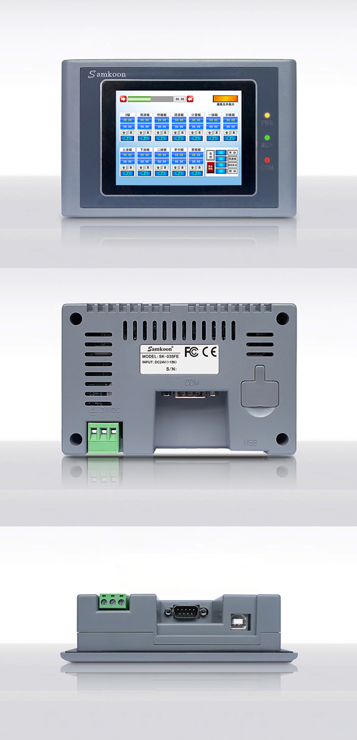 Samkoon SK系列觸摸屏是一款基于Linux系統的人機界面,符合EN55022和EN55024標準,符合FCC、CE、Class A,具有很強的抗干擾能力,符合工業環境的電磁兼容要求。該款產品配備有高性能的Cortex A8處理器,及高容量FLASH,可存儲大量數據,實現數據斷電不丟失;支持U盤存儲,可以實現數據的導入導出、工程更新及配方更新功能;支持在線及離線模擬,可直接從PLC中獲取數據;支持串口打印機,顯現畫面及數據打印;支持一屏多機,實現最大連接32個PLC或智能設備;支持多國語言,可實現5種語言任意切換;支持以太網通訊下載功能。